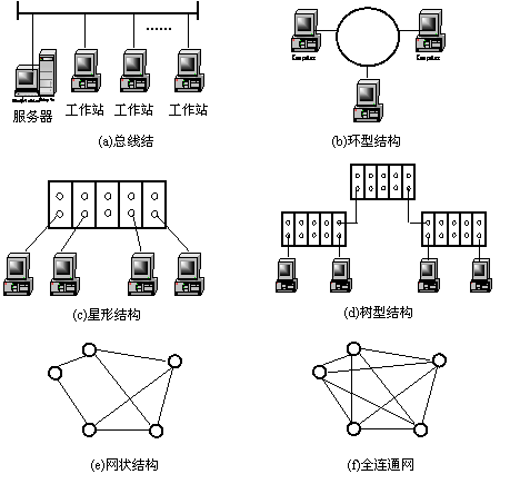 根据实际应用需要,数据通信网可以连成多种拓扑结构,典型的拓扑结构有 6 种,如图 3-1 所示。从拓扑结构来看,网络内部的主机、终端、交换机都可以称为节点。
